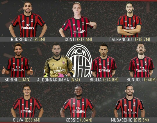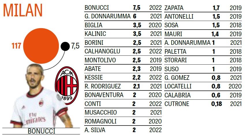 Зарплаты игроков Милана на сезон 2017/2018. Второе место в Серии А после Ювентуса (€164M). Самый высокооплачиваемый игрок - Бонуччи [GdS]