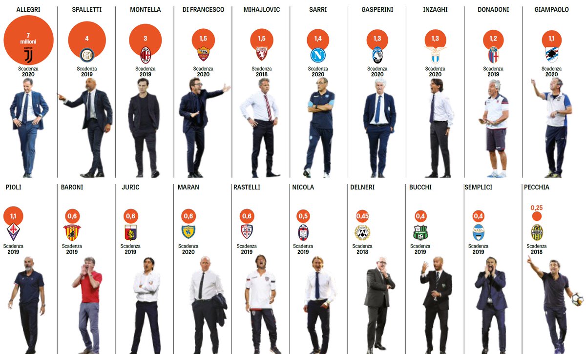 Оклады главных тренеров Серии А на сезон 2017/2018. Монтелла располагается на третьем месте (€3M в год) [Gazzetta dello Sport]