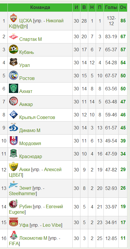 16-й сезон: турнирная таблица