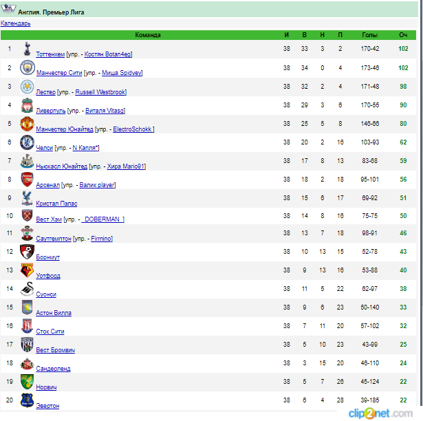 16-й сезон: турнирная таблица