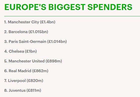 La Gazzetta Dello Sport опубликовало рейтинг клубов по тратам на трансферы за последнее десятилетие. Вот как выглядит его первая восьмерка.