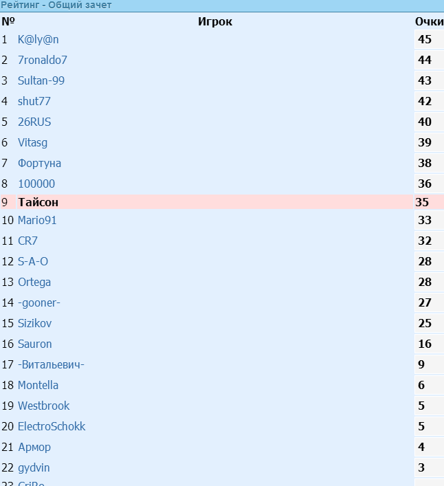 3 место: Sultan-99 40 баллов в рейтинг + 10 мастерства в клуб обычный в ФМ + бронзовая медаль + 50 млн. на счет клуба в ФМ